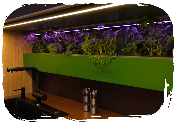 Mutfağımızda, kendi yetiştirdiğimiz, Nane, Fesleğen, Domates, Salatalık, Biber gibi ürünleri hem taze hem de ihtiyacımız kadar ürünleri en az atıkla yetiştirmiş oluyoruz. Bu ürünlerin gelişimini desteklemek için led tabanlı ultra viole ışıklar kullanıyoruz. Sulama sistemi standart olarak manuel sulama ile sağlanabiliyor. Opsiyon olarak otomatik sulama sistemi bu sisteme entegre edilebiliyor.
